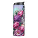 Una figura serena con el cabello largo y fluido de plata trenzado intrincadamente y adornado con peonías vibrantes rosadas y púrpura y un delicado clip de pelo de mariposa, se absorbe suavemente de un café helado con una paja púrpura. El fondo es una mezcla suave y brillante de rosa pastel, violeta y azul, creando un ambiente etéreo y de ensueño.