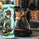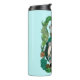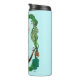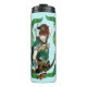 Un elfo de cabello rojo sostiene un arco y una flecha está enmarcado con hojas verdes en un fondo azul
