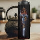 Un pequeño dragón rojo sentado sobre una espada con la cola envuelta en la espada