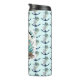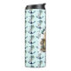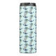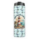 Botella de agua termal Beach Life. Ilustracion de una escena de playa con faro, tablas de surf, palmeras y delfines.