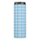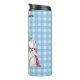 Esta botella termal de tambor para mantener tus bebidas frías o calientes es una manta azul y blanca con una alegre gata madre blanca usando un arco punteado de polka rosa sentada con sus tres gatitos todos con arcos rosados. Personalizar el texto con la plantilla.
