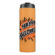 Feliz ilustracion de Halloween al estilo cómico con diseño de texto, murciélago y decoración de estrellas en medio tono de fondo. Es posible cambiar el color de fondo y añadir uno diferente al diseño con su elección.
