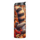 Este alegre ilustracion cuenta con un bonito mapache juguetonamente tendido entre un montón de calabazas naranjas brillantes, hojas de arce rojas caídas y bellotas. El fondo muestra un bosque con luz dorada filtrándose a través de los árboles y más hojas caídas, creando una cálida y festiva escena de otoño.