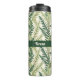 Los elegantes frentes de helecho en verde claro y oscuro, en un fondo blanco roto, hacen un tumbler térmico elegante y femenino. Igualmente en casa en la oficina o en el mercado de los agricultores.