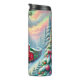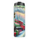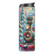 This cheerful artwork depicts a vibrant red and green Christmas train, adorned with festive wreaths and colorful ornaments, steaming through a snow-covered pine forest. The decorated trees and soft, pastel-hued sky create a whimsical winter wonderland. This delightful scene beautifully captures the joyous spirit and magical charm of a holiday journey through an enchanting, snowy landscape.