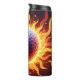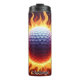 Este ilustracion dramático representa una bola de golf envuelta en un aura feroz de llamas rojas y naranjas. La bola en sí misma tiene un esquema de color degradado, pasando del rojo al azul, añadiendo un toque único y patriótico. El diseño intenso y brillante es a la vez potente y dinámico.