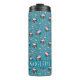 Estos tiernos tumblers termales personalizados tienen un patrón original de ave flamingo tropical en tonos rosa, dorado y verde sobre un fondo verde azulado. El estilo flamingo tiene un toque retro geométrico Art Deco (pensemos: Art Déco estilo Miami) con viñas de plantas sinuosas y formas rectangulares de colores dorados. Use la plantilla para agregar fácilmente su nombre.