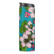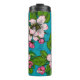 Flores de manzana dibujadas a mano y abejas con un fondo turquesa