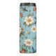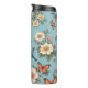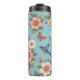Esta es una botella de agua de fondo azul claro con flores, pájaros y mariposas.