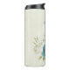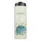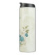 Hermoso tumbler térmico romántico con flores azules y blancas y hermosas hojas verdes.