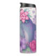 Este adorable ilustracion cuenta con un delfín bonito de estilo personalizado con ojos púrpura grandes y expresivos y mejillas rosadas. Está rodeada de flores rosas y violetas, con rosas y flores con pétalos en forma de corazón. El delfín tiene una gran flor rosa en la cabeza y el fondo es una mezcla suave y pastel con corazones rosa y morados flotantes y acentos brillantes.