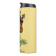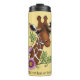 Retrato de una tierna jirafa sobre un fondo amarillo con flores rosas.