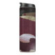 Un hermoso paisaje con texturas únicas que muestran un faro al borde del acantilado y un océano nocturno nebuloso con una luna en alza y un cielo estrellado en tonos rojos, rosas, dorados, plateados y azules.
