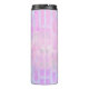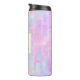 Botella de agua con un patrón de fondo abstracto. Las acuarelas rosas moradas y azules componen este diseño artístico que presenta formas rectangulares verticales sobre un fondo suave de mosaico. Un cuadrado sobre la parte superior con un falso borde de Relieve metalizado dorado, tu texto personalizado dentro.