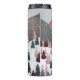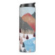 Un hermoso paisaje con texturas únicas que muestran un paisaje de río y montaña con un zorro en caza de salto medio en la nieve en tonos rojos, verdes, azules y beige.