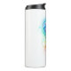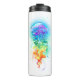 Grandes medusas de azulejo brillantes, de dibujos artísticos, con largos tentáculos en blanco, pintadas con fondo multicolor de acuarela. Mariscas arcoiris.