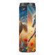 Esta imagen presenta dos majestuosos caballos, uno blanco y otro dorado-marrón, con manes flotantes, galopando a través de un campo lleno de espías rojas y naranjas vibrantes. La puesta de sol arroja un cálido resplandor dorado por el paisaje, con un cielo degradado de azul intenso y naranja feroz. La caída de hojas se suma al sentido dinámico del movimiento en esta escena pintoresca y etérea.