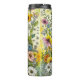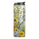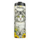 Arte estilo arte folclórico ai que representa a un lindo gato gris y blanco sentado en flores amarillas y blancas.