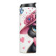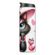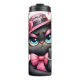 Este ilustracion humorístico presenta un gato negro con expresión gruñón y grandes ojos azules. El gato lleva puesto un gorra rosa de gran tamaño, un arco a juego y una pulsera de perlas. Está rodeada de corazones rosados dispersos, un pequeño pájaro azul enfurecido y un pájaro rosado con ojos grandes, lo que crea una escena navideña caprichosa y sarcástica