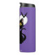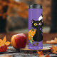 Un lindo gato negro con calabaza naranja, bellotas, murciélago y luna llena en un fondo morado