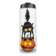Caricatura divertida y asustada de Cat Halloween de pie sobre una traviesa calabaza de risa. Original ilustracion vectorial humorístico Copyright BluedarkArt TheChameleonArt.