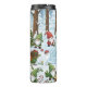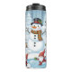 This is a highly detailed and playful Christmas illustration designed as a festive scene. The artwork features a large, cheerful snowman in the center, adorned with a top hat and a red and green striped scarf, standing in a snowy forest.