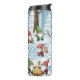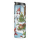 The scene is populated by many happy gnomes engaged in various winter activities: ice skating on a frozen pond, gathered around a bonfire, carrying gifts, and decorating a Christmas tree. Other delightful elements include a sleigh full of gifts, an ice sculpture, a small owl, and scattered toadstools. The background is a bright winter wonderland of snow-covered pine trees and falling snow. The overall style is whimsical, warm, and highly engaging, making it a perfect, detailed design for a holiday tumbler.