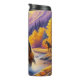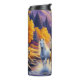 Three majestic horses, a white, a golden, and a brown, gallop dynamically through a shimmering stream in a breathtaking golden autumn valley. Surrounded by vibrant orange foliage and towering purple mountains, this stunning artwork captures the untamed beauty and spirit of wild horses in a rich, fantastical landscape.