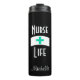 Diseño para enfermeras y hace una idea de regalo para cualquier ocasión. Antecedentes negros de Personalizable con gorra y cruz médica verde azulada blanco y turquesa en frente del tumbler. "Vida de enfermera" es en tipografía blanca.