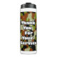 Botella de agua blanca de la persona del servicio militar con diseño de camo, mensaje "gracias por tu servicio" en la parte delantera.