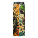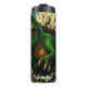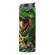 A powerful green T-Rex with menacing yellow eyes and a wide-open, roaring mouth bursts dynamically through a shattered wall. Debris flies as it emerges, set against a background of orange and blue radial lines, creating an impactful and action-packed scene.