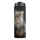 Sentado tranquilamente un gato gris esponjoso y bien crecido. Parece que las rayas de las manteles atraviesan ligeramente la piel.