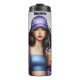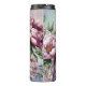 Una figura de diseño con pelo largo, oscuro, ondulado y gorra de béisbol morado sostiene un café helado con ambas manos, mostrando uñas manicuradas. Lleva una cubierta azul de tubo y una chaqueta morada de flores sobre sus hombros. Las peonías grandes, blandas, púrpura y blanca y los sutiles acentos de brillantez forman un fondo fresco e informal.