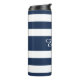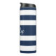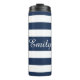 Tumbler térmico con guión de rayas azules modernas. Tumbler térmico con estampado de rayas azul y blanco negrita e impresión de nombres personalizada. Escriba su nombre en el campo de plantilla para personalizarlo. Cena y accesorios de cocina a juego disponibles.