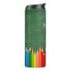 Un moderno tumbler personalizado para profesores con fondo de tiza verde con lápices de colores. Nombre del profesor en guión. texto personalizado en la parte inferior de una fuente serif.
