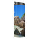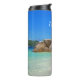 Tumbler termal con una fotografía de una playa azul turquesa de océano con grandes rocas esparcidas a lo largo de la costa. Lugar tropical luminoso y soleado.