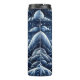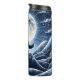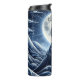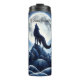 Esta imagen retrata una majestuosa silueta de lobo frente a una luminosa luna llena, que aullan sobre un estilizado paisaje montañoso azul. El cielo nocturno está lleno de un resplandor celeste, estrellas brillantes y formaciones de nubes que mejoran la calidad onírica y etérea de la escena. Las montañas se representan con intrincados patrones ondulados, dándoles una textura única.