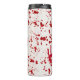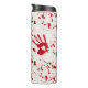 Diseño gráfico con huellas rojas y sangre salpicada en un fondo blanco. Una cinta amarilla de precaución recorre el centro, agregando una sensación de advertencia y misterio.