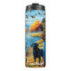 Esta detallada obra de arte retrata a un cazador con un rifle sobre su hombro, acompañado por dos fieles perros —un labrador negro y un recuperador de oro— parados al lado de un río sinuoso. El lugar está situado en un vibrante paisaje otoñal, con árboles de hojas de naranja y numerosos patos en el agua y sus alrededores, mientras que una bandera estadounidense ondea al fondo.