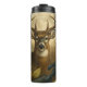 En un bosque exuberante, se alza una majestuosa roca con nevados prominentes, con una luna llena brillando suavemente en el fondo. Un rifle de caza con alcance descansa en primer plano, rodeado de hojas de otoño, agujas de pino y una lupa que simboliza la persecución del cazador en la naturaleza.