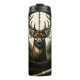 Un ciervo majestuoso con renos prominentes se centra en el punto de mira de un rifle, su mirada hacia adelante. La escena se sitúa en un telón de fondo de densos pinos, con dos cartuchos de rifle sobre una superficie de madera en primer plano, lo que sugiere con fuerza un escenario de caza. La obra tiene una calidad ilustrativa y detallada.