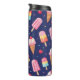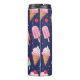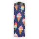 Pattern on blue background with creamy ice cream and popsicles, cherries and confetti floating around. Cute whimsical food design.