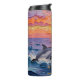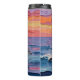 An ai impasto style dolphins swimming with a pink, orange and purple sunset over the ocean . A beautiful coastal tumbler to add a beachy touch to your drinkware.