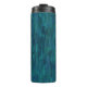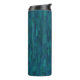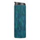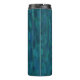 This thermal tumbler features a pattern of overlapping impressionist brush strokes in shades of navy, teal, turquoise and blue.