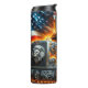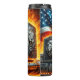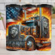 Esta imagen muestra un camión personalizado con un cuerpo oscuro y metálico, adornado con motivos audaces para la cabeza de león en la rejilla y la cabina de dormir, y llamas cromadas estilizadas. El fondo es una combinación dinámica de una bandera norteamericana ondeando e intensas, brillantes llamas naranjas y amarillas, creando una escena poderosa y patriótica.