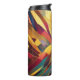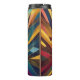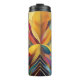 En el centro converge un conjunto vibrante de formas geométricas y audaces, formando una composición simétrica y colorida. La pieza usa una variedad de tonos, que van desde amarillos cálidos y naranjas hasta azules y morados fríos.