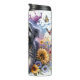 Un Lhasa Apso esponjoso con una expresión feliz, jadeante, está rodeado por una ráfaga vibrante y pálida de girasoles, peonías púrpuras y mariposas extravagantes. La composición artística refleja perfectamente la personalidad alegre de la raza en un ambiente florido y animado.