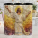 Este estilizado ilustracion religioso representa a Jesucristo con sus brazos extendidos, representado en un estilo de arte tridimensional de papel doblado. La figura se compone de formas angulosas y de baja polilla en tonos blancos y beige. Detrás de la cabeza se encuentra un halo dorado, situado en un fondo de mosaico geométrico y vibrante de colores cálidos.