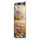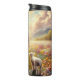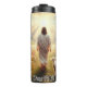 Esta serena imagen representa una figura en una bata blanca que camina a través de un vibrante y colorido campo de flores silvestres. Un pequeño cordero blanco camina fielmente a su lado. El fondo está formado por colinas onduladas y un sol brillante que brilla a través de nubes celestiales, creando un paisaje pacífico y espiritual.