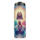 Esta imagen etérea representa una figura con grandes alas radiantes y una bata con un gradiente colorido. Sus manos están apretadas en oración. Tiene un halo brillante, y el fondo es un mosaico kaleidoscópico, giratorio de luz y figuras aladas más pequeñas, creando una visión surrealista y espiritual.